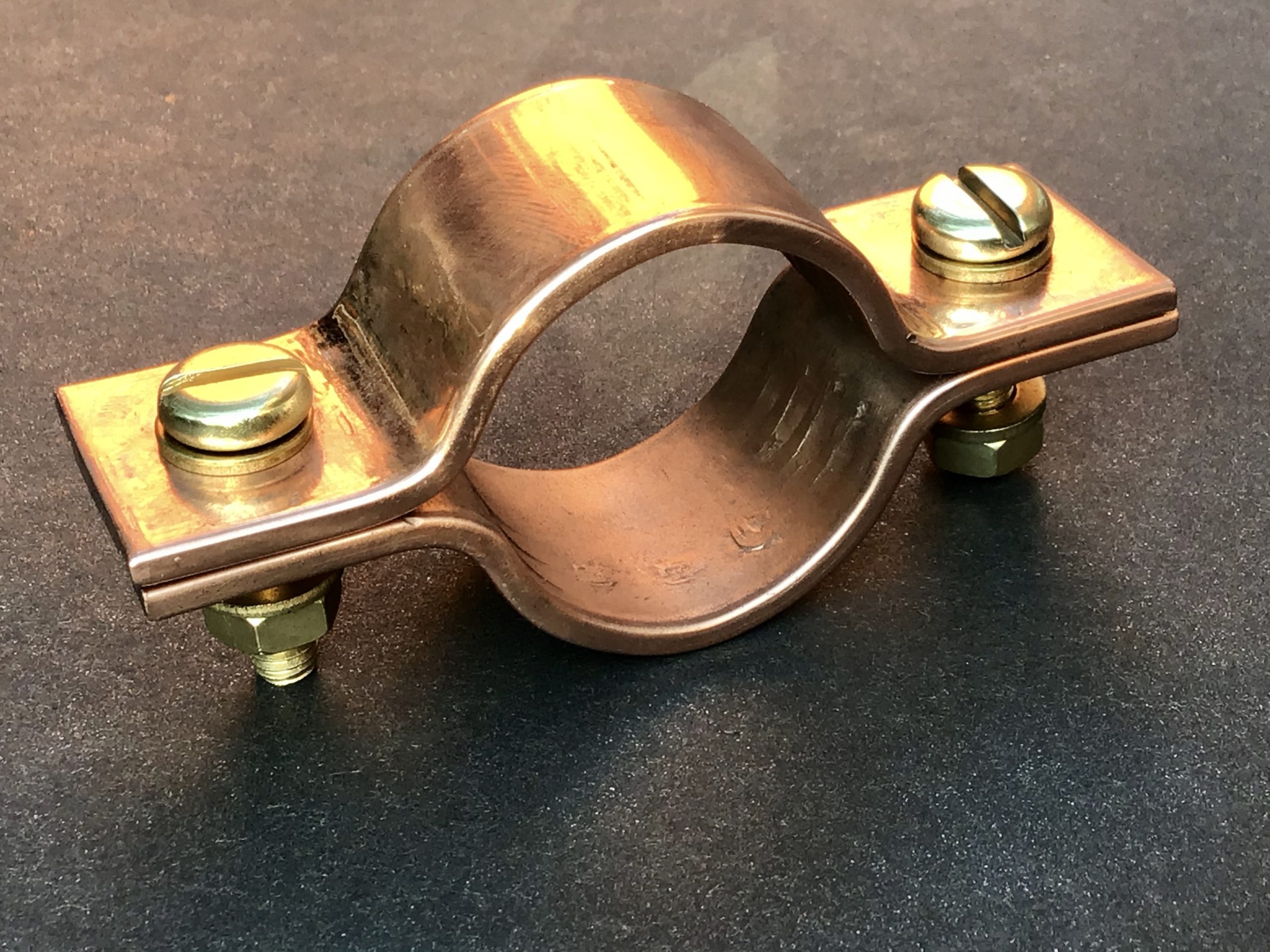 Copper pipe clamp 35mm ideal for pipes with an outside diameter of 35mm, made from 1/8” thick solid copper. The banding is 25mm (1”) wide.