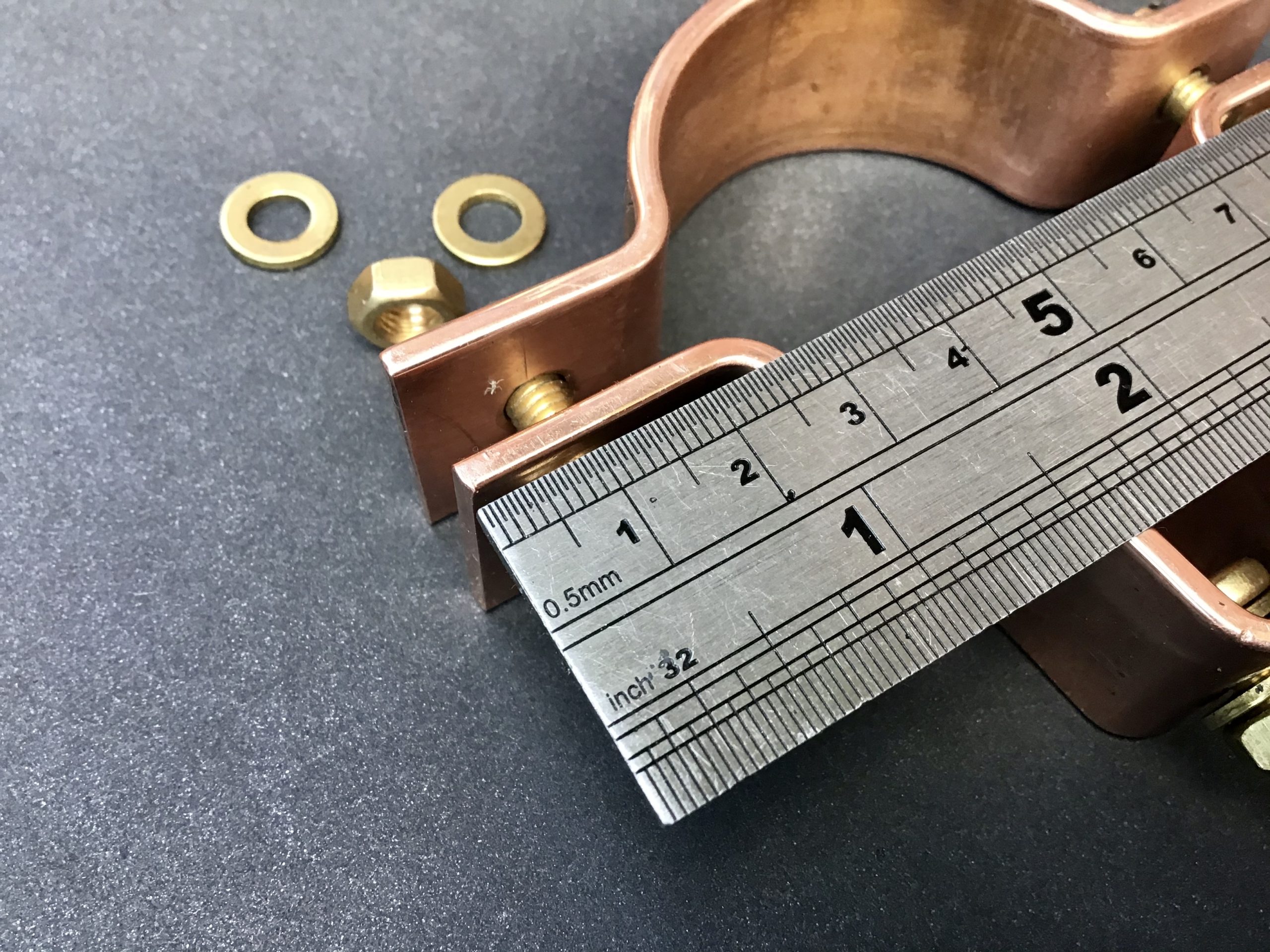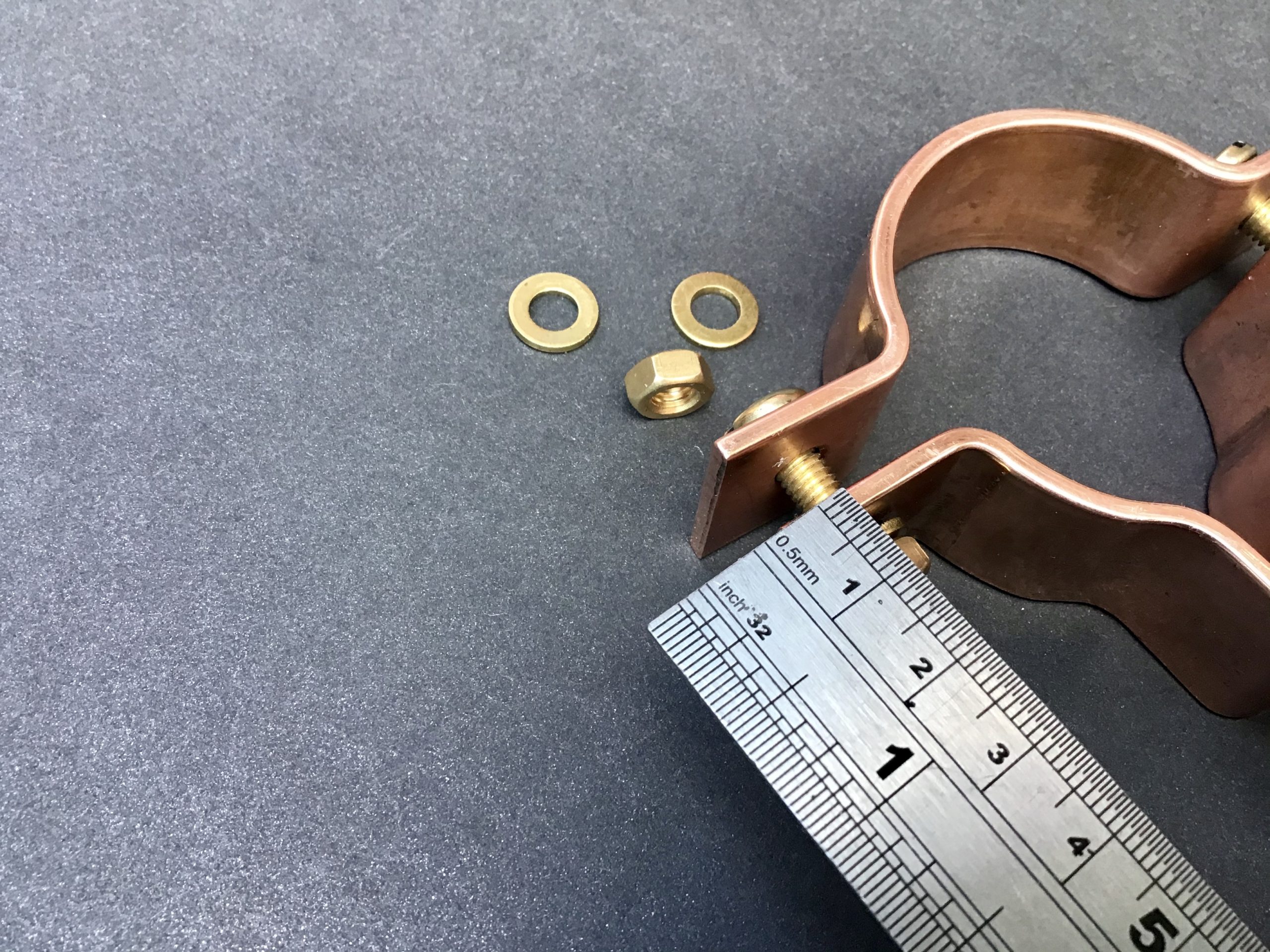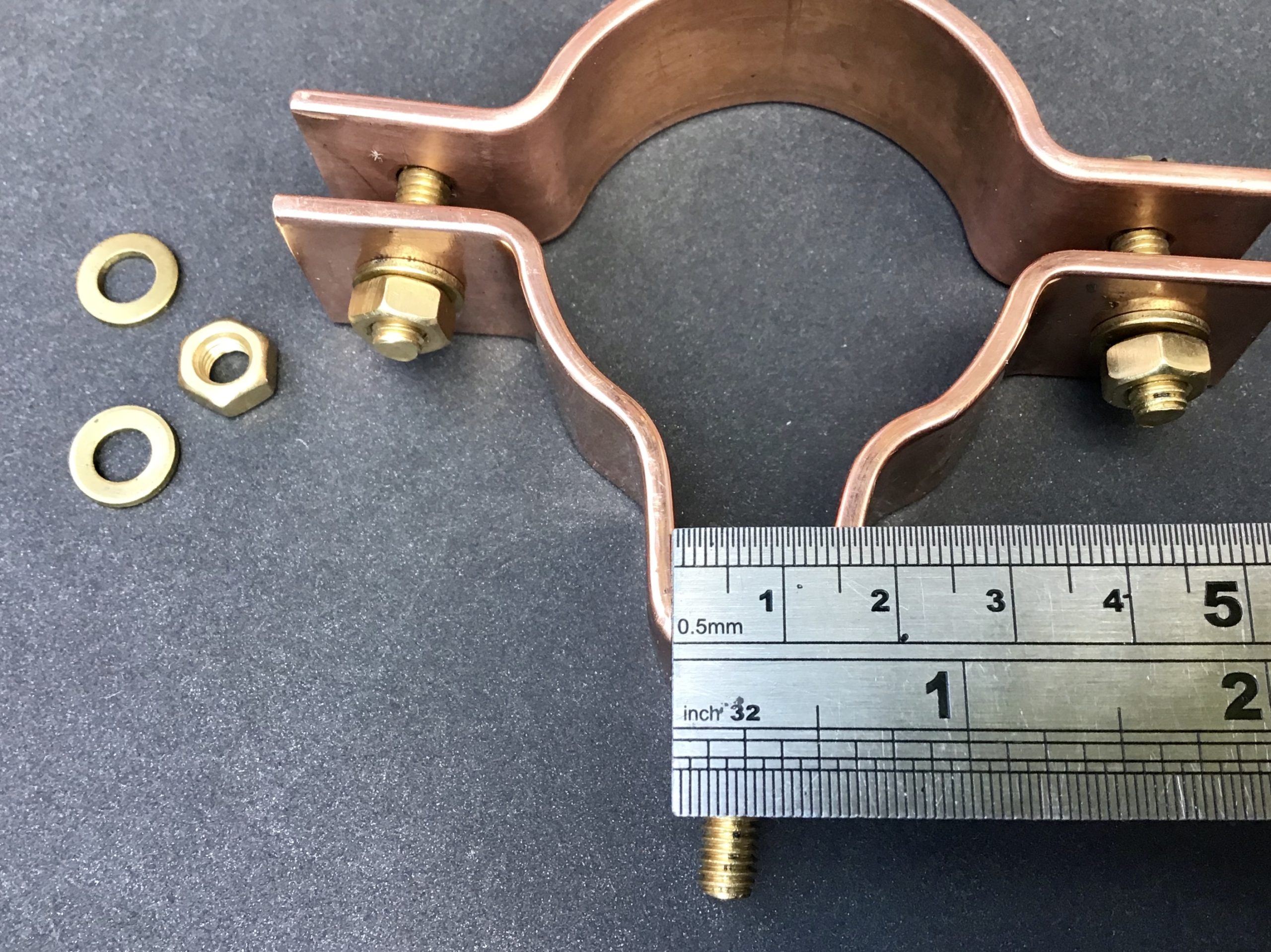 Our copper universal pipe clamps come with brass fittings M6 (6mm) pan-head screws, nuts and washers.
